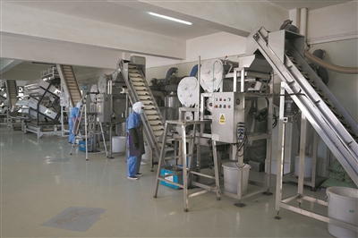 在温州佳海食品有限公司车间内,机械流水线不停运转,工人正在包装产品,现场一派繁忙景象。