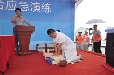 随着台风汛期的到来,如何做好防台度汛,确保人民生命财产安全是当前一项重要工作。6月20日下午,瓯江口新区举行防台度汛综合应急演练,进一步提高新区险情综合处置能力和应急救援实战水平。整个演练活动包括“防台避险”、“人员救援”、 “应急抢险”等内容。图为现场对“落水受伤人员”进行“心肺复苏”急救措施。