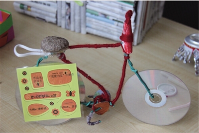 用易拉罐做成的“太妃椅”,精致可爱;用一次性筷子做成的“收纳盒”,有趣实用;用塑料袋做成的“玫瑰花”,大气漂亮……近日,霓屿街道开展了青少年“变废为宝”环保创新小制作比赛,身边随处可见的废品,在孩子们的巧手和智慧下,“变身”成为一件件构思巧妙、制作精美、色彩艳丽、充满童趣的“小艺术品”。图为废弃材料制作的自行车。 沈莎丽 摄