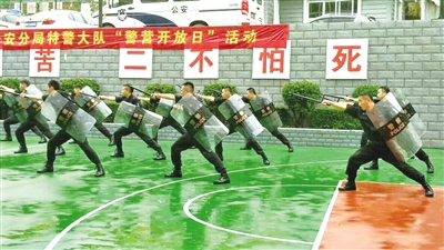 为零距离了解警营文化,全方位地展示警务技能。洞头区公安分局特警大队在区武警中队大院举行“警营开放日”活动。活动中,60余名特警队员们冒着大雨为大家表演了列队、擒敌拳、摔擒术、警棍盾牌操和重装战术队形等科目,英姿飒爽的动作,赢得了大家的阵阵掌声,充分展示了特警队严格的纪律作风和过硬的警务技能,让在场的观众大饱眼福。